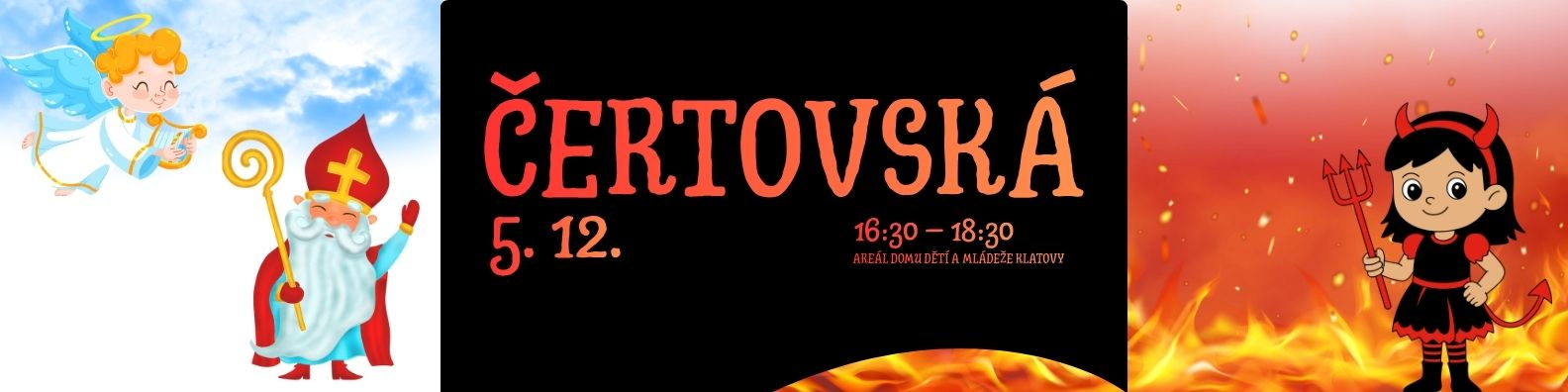 Začneme tajnou cestou od hlavní brány okolo plotů přes Havlíčkovu ulici, abychom se dostali do spodní části areálu (přes horní část nebude vstup otevřen, abychom nechodili přes staveniště). Ve spodní části nás čeká Nebe a Peklo. V nebi najdete Mikuláše a anděly, od kterých si můžete vyzvednout malou odměnu za splněné úkoly z tajné cesty. Do Pekla mohou jen ti odvážní. Kdo nechce, za čerty vůbec nemusí. Třeba nakouknou jen zpovzdálí. K dispozici bude teplý čaj. Můžete si přinést špekáčky a opéct si je na ohni.